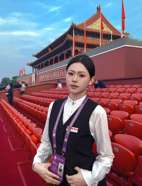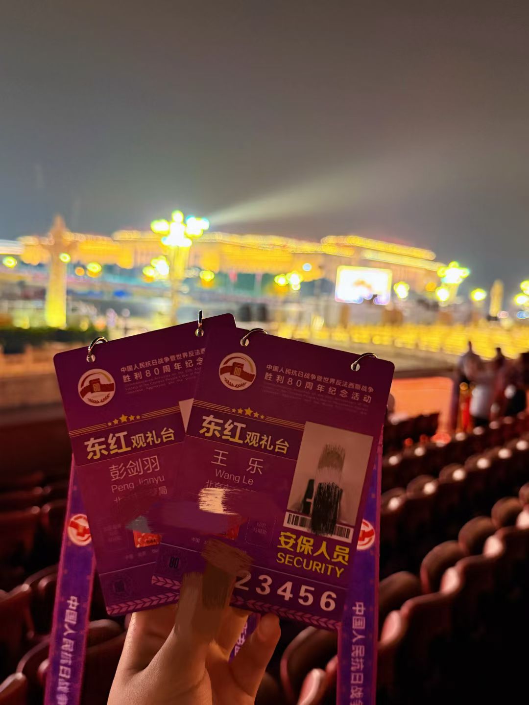 在抗战胜利80周年阅兵礼仪人员的选拔过程中,王乐同学凭借扎实的专业基础、优雅的仪态举止和过硬的政治素质,历经层层选拔 最终获选,被确定为观礼台安保,承担了这一具有重大历史意义的礼宾和安保任务。