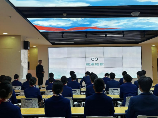 班会中,各班级围绕三大核心目标分层推进:聚焦“心灵向阳”,通过情绪管理分享、心理小故事交流,引导学生学会调适心态、积极面对学业生活;紧扣“法治护航”,结合旅游行业案例讲解法律法规,强化学生规则意识与安全防范能力;立足“感恩诚信”,以“身边的诚信小事”“感恩瞬间分享”等互动环节,培育学生感恩情怀与诚信品格。
