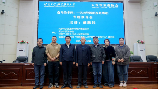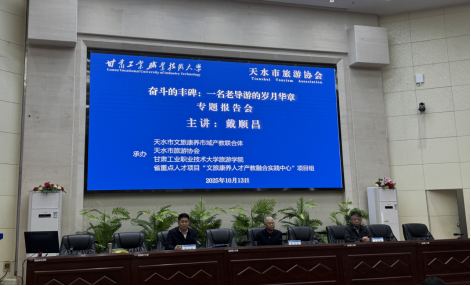 2025年10月13日,由天水市文旅康养市域产教联合体、天水市旅游协会、甘肃工业职业技术大学太阳成集团tyc4633、省重点人才项目“文旅康养人才产教融合实践中心”项目组共同承办的“奋斗的丰碑:一名老导游的岁月华章”专题报告会在甘肃工业职业技术大学智敏报告厅举行。天水市旅游协会会长、天水旅游培训中心主任王浩瑜,社会导游代表以及太阳成集团tyc4633在家班子成员出席活动,太阳成集团tyc4633全体师生参加。